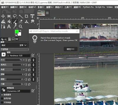 接著如下圖先選擇筆刷工具,在新增的圖層上畫出要保留的區域後,再按下圖的確定鍵